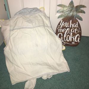 This is a light washed button up chambray shirt that ties at the bottom giving a crop top look. It has two pockets that also button and has a collar to it. It is a size small, but the size on it says 10 in the U.K. **There is one small dark smudge on the back**