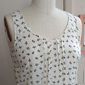 doLightweight bow patterned cream tank top. Black bows with green polka dots, pin tucks and racerback.