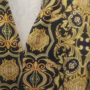 This cape is a nice accent piece to wear over a plain outfit. It is unlined, lightweight and longer in the back than in the front. It also has a hook & eye closure in the front.