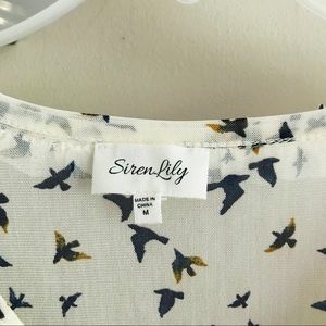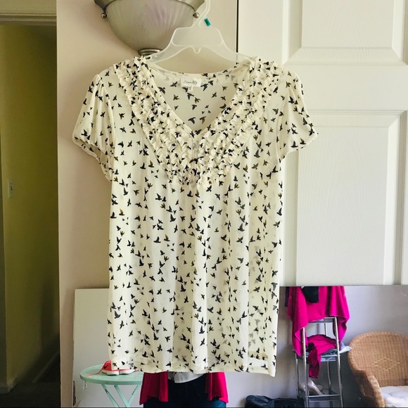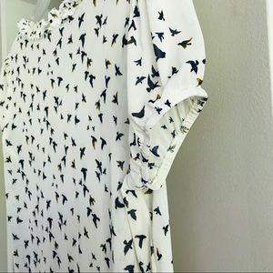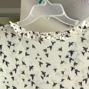 NWOT. Very lightweight, requires a camisole or something underneath! Cream/white color with dark navy bird pattern. Pretty ruffle detail up top and longer length. Ask any questions!