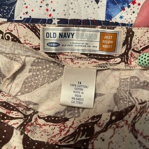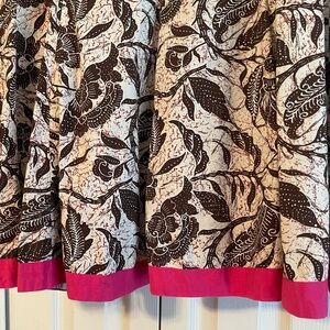 Gently worn size 14 Old Navy skirt. Beautiful brown floral print. Love the pink trim around the bottom! Very lightweight. It has a hidden side zipper with a hook closure at the top. No stains, smoke free home.