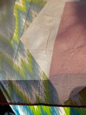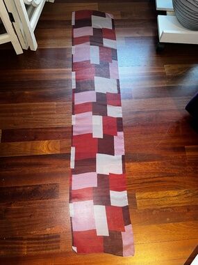 Long, rectangular scarf with a geometric pattern of colored blocks in various shades of red, pink, white,