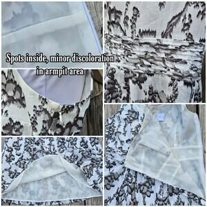 Lightweight 100% cotton fabric w/ abstract floral print in shades of grey. Sleeveless, scoop neck, side zip, fully lined. Decorative band on waist w/ pleats/pintucks & raw edges. New, with tags. Shelfwear issues noted in photos. Size 10 by Ann Taylor LOFT Outlet.