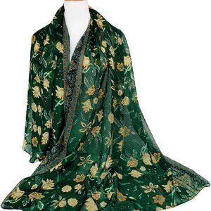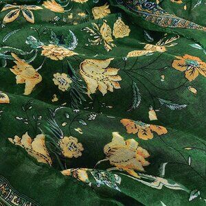 This lightweight cotton scarf is perfect for adding a splash of floral charm to any outfit. The vibrant green and yellow tones with a vintage flower sea print make it a cheerful and versatile accessory for summer days and special occasions.