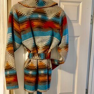 Great throw on to go anywhere and keep warm without weight or bulk. Classy and casual with deep slant pockets to keep hands warm. Rich colors are gorgeous. I took great care of it so it's as good as new. I am ready to try another color palette!
