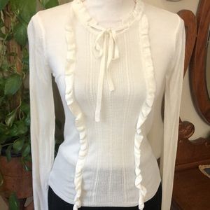 This is a very Feminine Lightweight Pull-over Sweater from MAK Sweaters, Size Small. Cream Color. Ruffled Drawstring Neckline that Ties. Ruffle Detail Down Front and on Sleeves. Perfect to dress up a Skirt or Pants for the Work Place or Pair with Jeans and Heels for a Very Feminine Look! Excellent Pre-Loved Condition. Approximate Measurements taken laying flat.