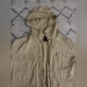 First 3 photo are similar style. Great for fall and layering! Size small and cinches at waist (can fit a medium!) Comes with attached hood.