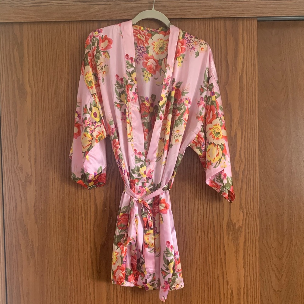Gorgeous pink-grounded floral printed robe. Lightweight & airy.