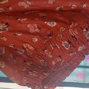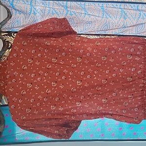 This floral top is so cute! It has a slight ruffle detail around the neck, down the front and around the top. It buttons down the front and has smocking around the sleeves and bottom band, so it's not only cute, it's comfortable! Size Large