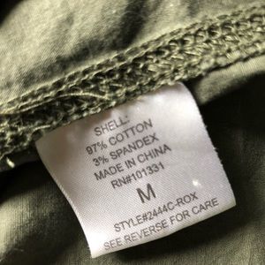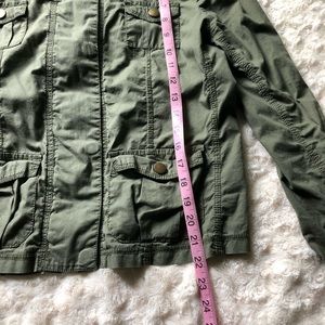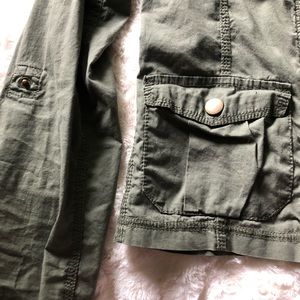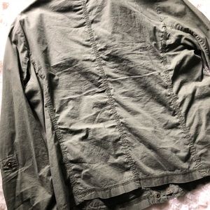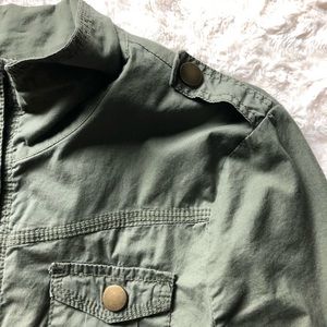 Lightweight olive green zip-up jacket with brass button details.