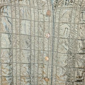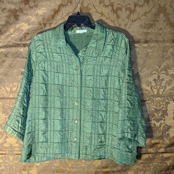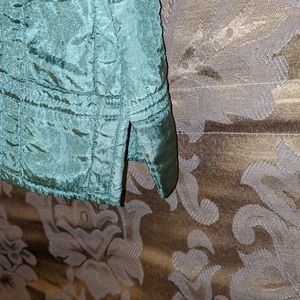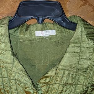 Olive green puffy style lightweight dress coat. Button up with slitted sides and button sleeves. Great condition but inside there is some rubbing wear from use. Picture shows wear.