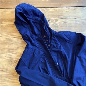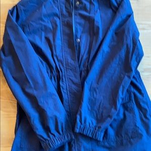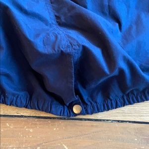 Light weight long jacket with hood slightly fitted at waist, zips and snaps up front, large front pockets, cute snap detail at back fitted around cuff girls size extra large (13/14) Navy blue. I love this Jacket, great for spring. My girls never wore it. Like new.