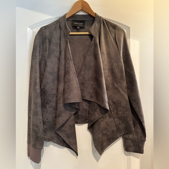 This is a lightweight jacket made to look like a very fine suede. The color is between a dark gray and light brown.