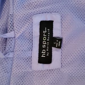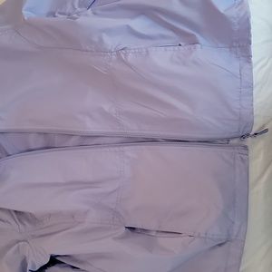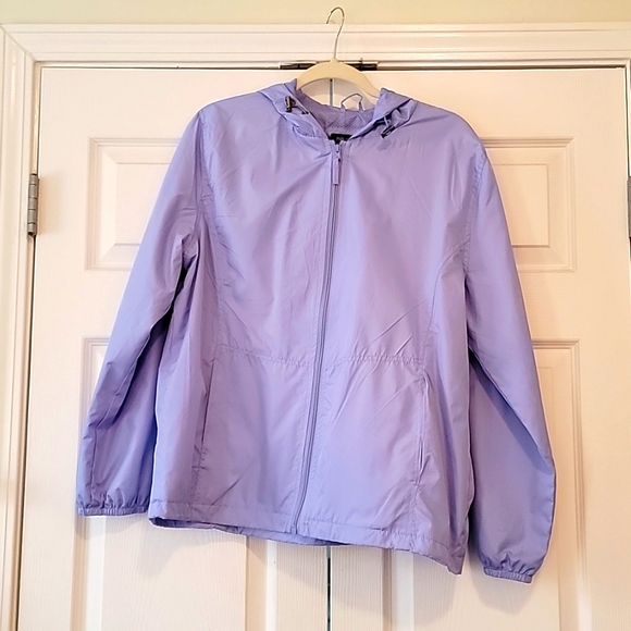 Lightweight periwinkle hooded zip up jacket w two front pockets includes drawstring to pull at the hood.