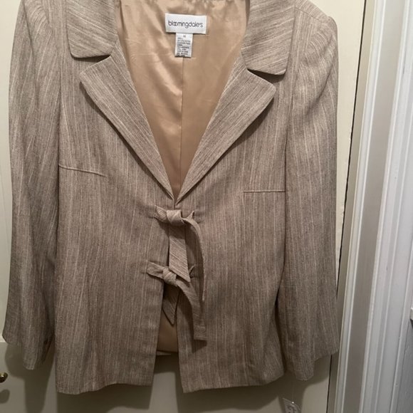 Soft beige shades and subtle stripes makes this short, lightweight jacket a winner for Spring. Polyester and acetate, with a tie waist, and fully lined. the jacket is a size 14Petite, and the hem sits just below the waist. Bloomingdale's brand, never worn, with tag still on.