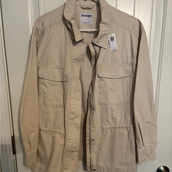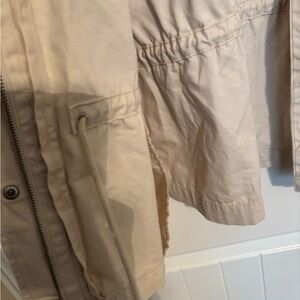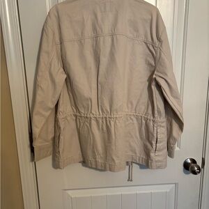 Cream color. Lightweight. Has zipper and snaps for closure. You can pull string on inside to tighten up at tail end.