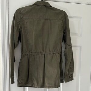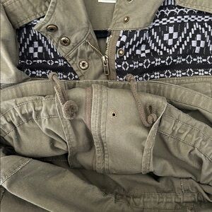 Stylish olive green jacket featuring a unique patterned detail. Perfect for adding a touch of elegance to your wardrobe.