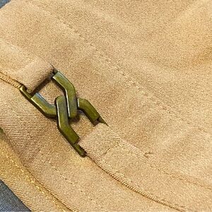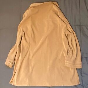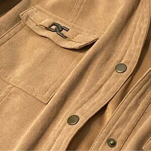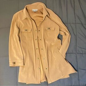 Camel brown soft lightweight jacket with snap button closures and double pockets with brass/gold buckle details
