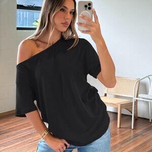 Features: This trendy but comfy oversized tee has an off-the-shoulder neckline that adds a flirty vibe, while the short sleeves keep it casual and easy to style. Made from a soft, stretchy blend of polyester, rayon, and spandex, it feels skin-friendly and breathable. Looser fit for maximum comfort and a laid-back look, perfect for layering or wearing solo.