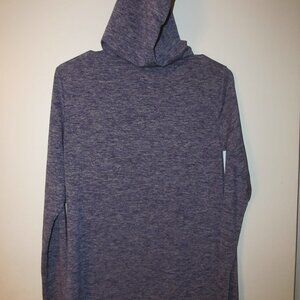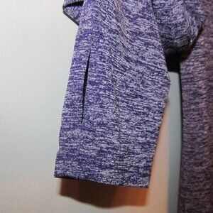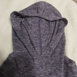 This is a beautiful lightweight Purple Hoodie made of thin, breathable material. Great for walking or running on cool mornings (that's why I I already have one!). Size small. In great condition, not rips, stains, holes or tears. From clean, smoke-free environment. Has thumb-holes on sleeves and hood is "free-form" (no annoying drawstrings!). Color is "Purple Heather" featuring a "snow" pattern that features purple with hints of grey. Perfect for windy and chilly weather, it's a great breathable layer.