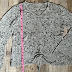 Lightweight Silver Grey Pointelle Knit Drawstring Front V Neck Sweater SZ M