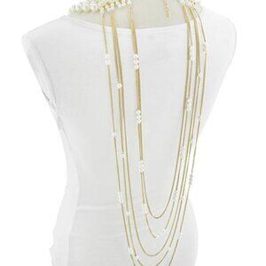 Pearls have a natural tendency to soften your face, and make you appear more feminine and beautiful. These are beautiful faux pearls that look natural with small pearl like beads in between each sphere, surrounded by gold tone chains that can be worn in the front or back. Statement necklace and earrings but also lightweight! See photos. Gorgeous!