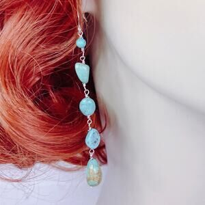 Features: Long dangle design; sterling silver wire wrapping; natural nugget and oval stones; artisan construction; lightweight