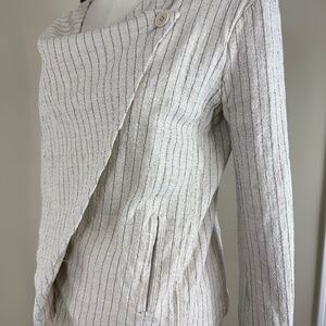 Cute lightweight jacket in light beige with blue pinstripe. Has a cowl-like neck line that buttons on the inside and outside. Pockets and textured fabric by Blank NYC. Great fashionable jacket!