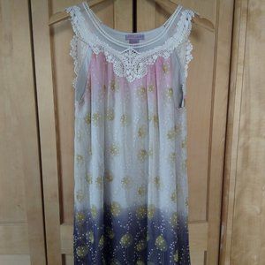 Shear with Slip underneath attached. Very flowy and forgiving. Baby Doll cut. Falls at knee.