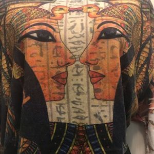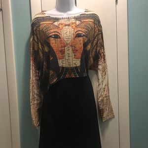 Long sleeved, drop shoulders, crew neck. Hem is midriff length. Bright colored design.