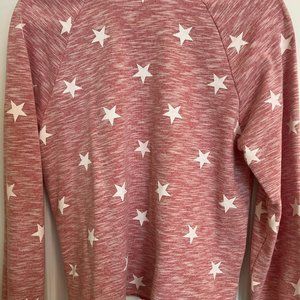 This cute top is like a lighter weight sweatshirt. Very soft and comfortable. Color is sort of a pink marbled effect with white stars. Great condition; no flaws. Pit to pit: 20" Length 22.5". Size large. 65% cotton, 35% polyester. PLEASE check out the rest of my closet for some awesome bargains. I need to downsize but first need to sell, sell, sell. Thanks for looking.