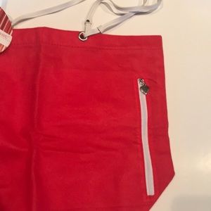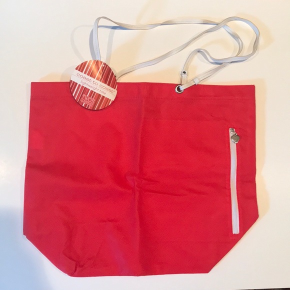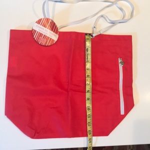 Lightweight Tote by Two’s Company. Zipper with silver heart pull unzips on side to reveal inside pocket.