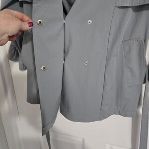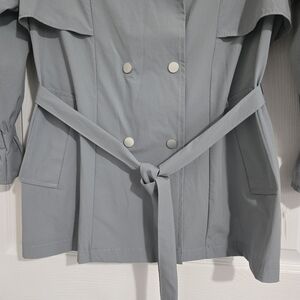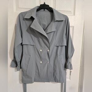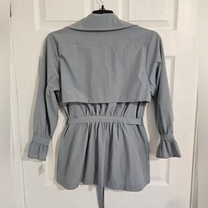 This is an unbranded stylish trench coat/jacket. Women's size medium. It's designed to be lightweight with soft smooth material. Has a snap-up closure, tie around the waist, and two side pockets. The sleeves are 3/4 length with a decorative ruffle end. The color is most accurate in the first picture-more like a bluish gray than an exact gray. The size and material tags are missing, but fits loose for a small and exact fit for a medium. Most likely a polyester blend material. In excellent condition except for a small stain on the collar, shown in picture.