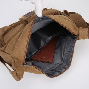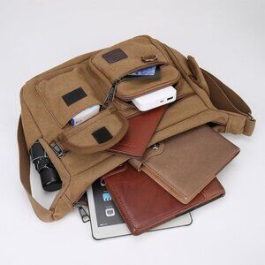 Features: Inspired by classic mailman and workwear styles, this vintage-inspired canvas bag sports antique zippers, a leather logo, and a flip pocket for a nostalgic touch. Made from durable, tear-resistant canvas with soft lining, it provides a safe home for your tech and essentials. The spacious main compartment fits a 13-inch laptop and tablets, while the front zipper pocket and side insert are perfect for keys, wallets, or stationery. The neutral, minimalistic vintage design makes it versatile for both men and women. Great for campus, work, or casual outings.