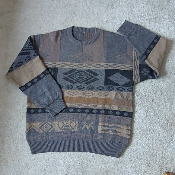 Chic lightweight wool sweater in a geometric pattern. It was bought in Europe and my Husband removed the Label because it was scratching him. The size reads 54 so I asume it is a L. In excellent like new condition. Please see measurments