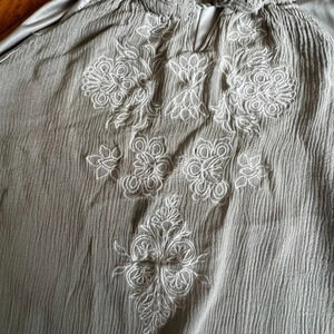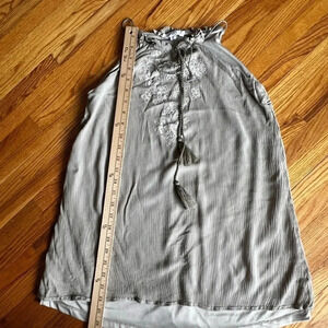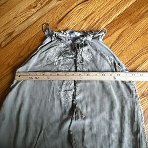 Lightweight adjustable top, size small. Light green color with white embroidered on the chest. There is a tear on the chest please see pictures. The string strap are adjustable by the tie in the front, tighten or loosen the strap by one string.