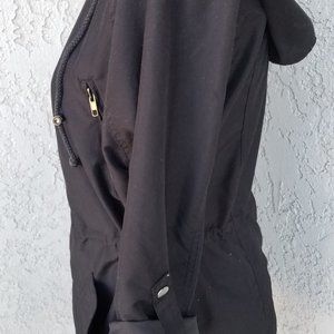 This fashionable black jacket is great for spring fashion. It's lightweight but will still keep the spring chill away. There are pockets for days and the cinch waist is very flattering.