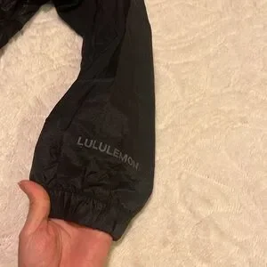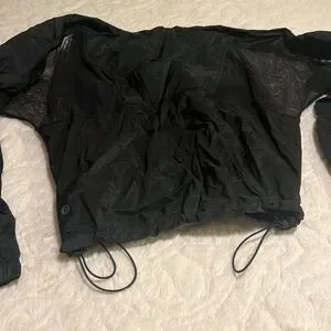 Very lightweight and airy with mesh on sleeves so it's very breathable and perfect for jogging. Very chic and in perfect condition. Has drawstring waist and zippered pockets.