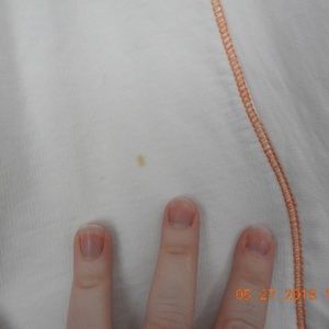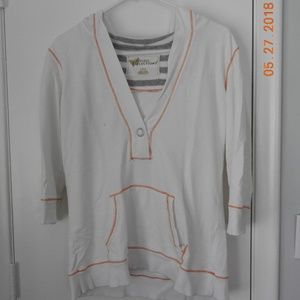 3/4 sleeve, cotton hoodie with orange contrast stitching. Small stain on the front, as shown.