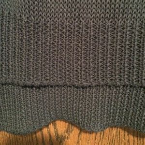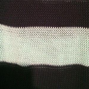 Cotton knit sweater with contrasting blue stripes. Slightly longer in the back with a split side seam.