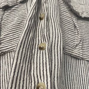 Grey and white striped linen button down. Sleeves can be full length or buttoned up as shown in photo. Very thin linen.