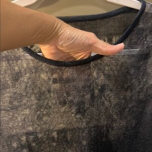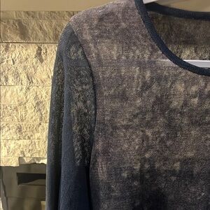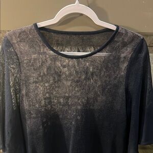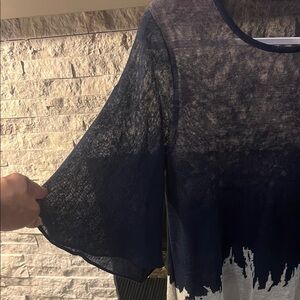 This navy blue blouse features a unique gray pattern on the bottom and tie dye effect on top. High quality top, Slightly sheer material and 3/4 length sleeves swing style for a more relaxed fit