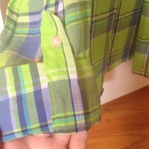 Lightweight flannel with sleeves that can roll up and be buttoned. Two chest pockets. No stains or snags.