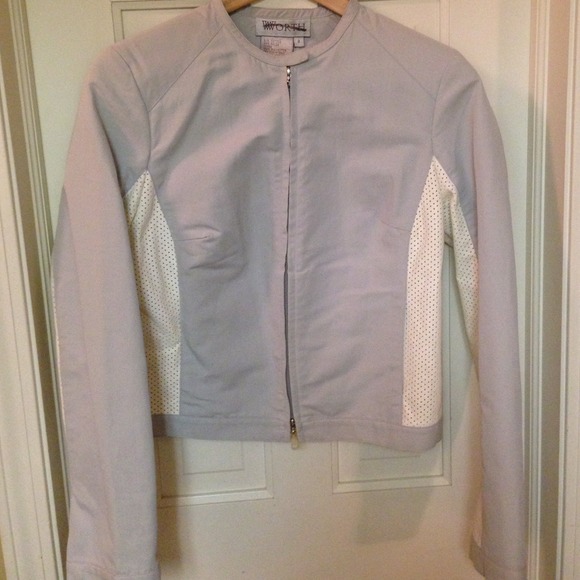 Dove gray and white zip up jacket. Bought at TJ Maxx therefore brand name has a line through it. Never worn but removed tags.
