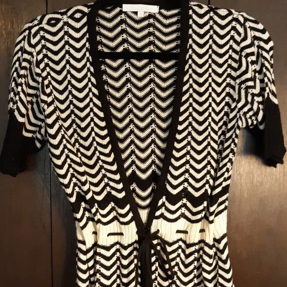 Cute little sweater thing! Lol I am having a total brain fart and cannot for the life of me figure out how to explain it!! It is lightweight. Ties in the front with one little button. Sits right at the top of your pants.