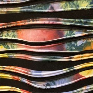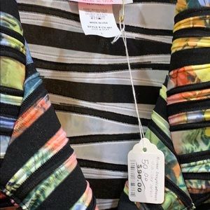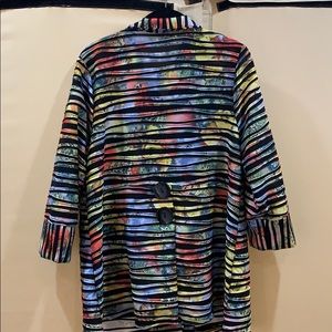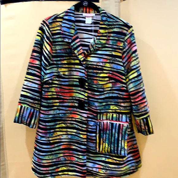 Multi colored jacket with pocket and three black buttons on for front closure. Split back with 2 black buttons for design.