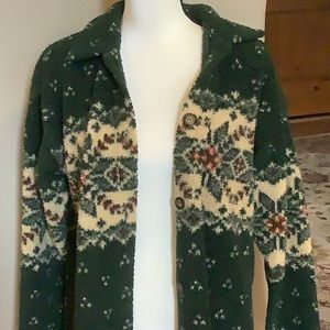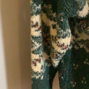 This is a jacket but throw on like a sweater. It’s lightweight just to cut the chill. 40% microfiber, 30% polyester, 30% acrylic. Like new condition.