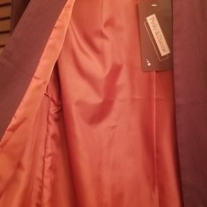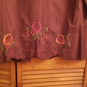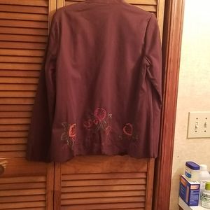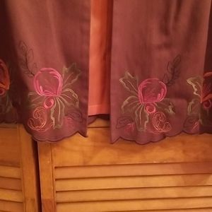 Charcoal brown jacket, long sleeves and lining on the inside. Flintstone ruffles at the bottom edges with beautiful designs.