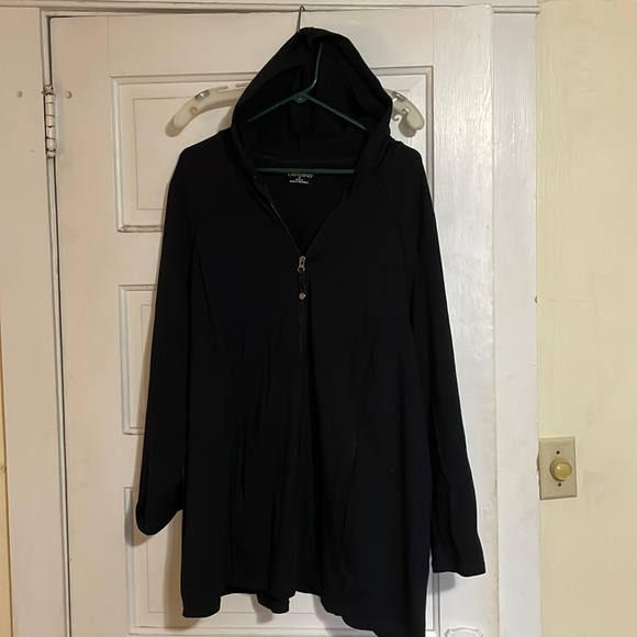 Lightweight jacket. Full zip with long sleeves, hood and functional pockets. Approx. 30-32” long. Black.