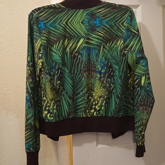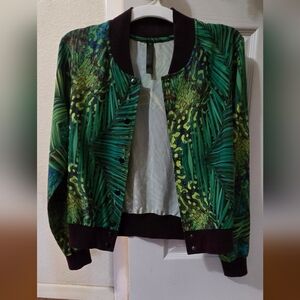 Reflex brand, thin, lightweight sporty jacket. Button closure, green pattern, dark purple ribbed trim. in great condition. Add personality to your casual outfit.